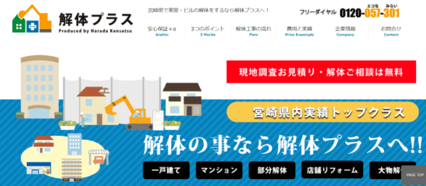 解体プラスは、昭和29年創立の原田建設株式会社が運営する解体工事専門サイトです。宮崎市を拠点に、70年以上にわたり地域のインフラ整備と建設事業に携わってきた実績を活かし、解体工事をはじめ土木・建築・産業廃棄物処理まで一貫対応。豊富な経験と確かな技術力を強みに、安心・安全を第一とした施工で、次の街づくりにつながる解体工事を提供しています。