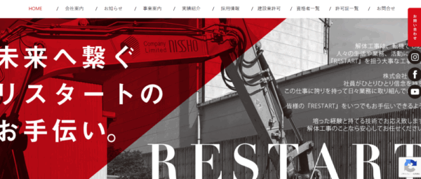 株式会社日将は、愛媛県松山市を拠点に建造物解体工事を主軸とした総合建設会社です。令和元年の設立以来、「RESTART」を合言葉に、解体工事を次の価値を生み出すための重要な工程と捉え、社員一人ひとりが誇りと責任を持って業務に取り組んでいます。住宅やマンション、店舗、ビルなど多様な建物に対応し、地域社会の再生や発展に貢献。確かな技術力と豊富な実績をもとに、安心して任せられる解体工事を提供しています。
